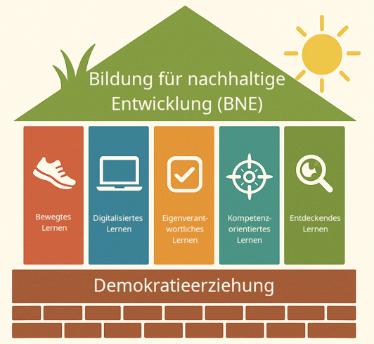 Unser Haus des Lernens steht auf festen Werten, mit einem offenen Blick in die Zukunft. So gestalten wir Schule als Ort des Wachsens, Denkens und Miteinanders – jeden Tag neu.