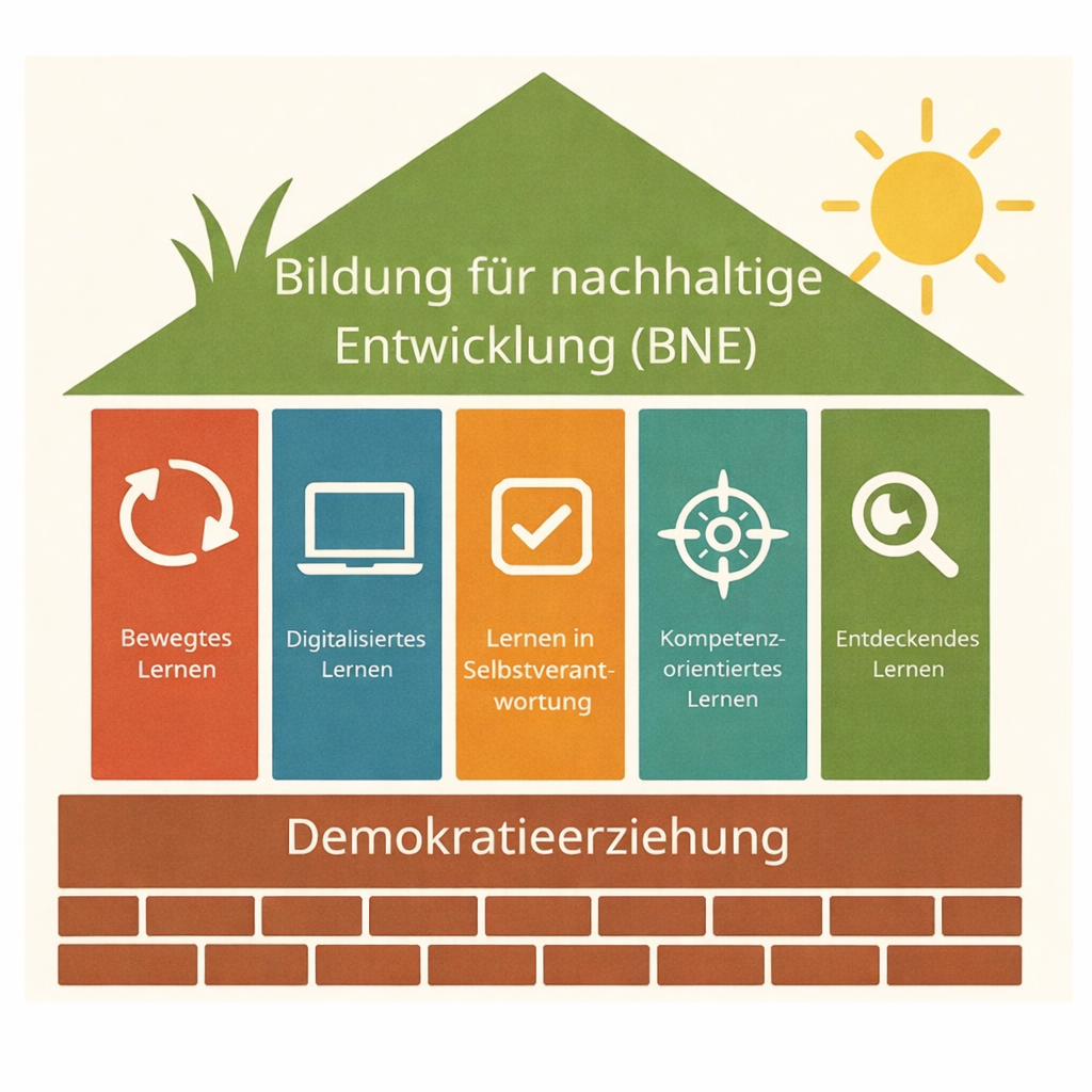 Lernen an der Schule Leuschnerstraße ist lebendig, zukunftsorientiert und ganzheitlich. Unser pädagogisches Konzept ist im Bild eines Hauses dargestellt: Es macht deutlich, welche Säulen unser tägliches Lernen tragen – und welches gemeinsame Ziel wir verfolgen.